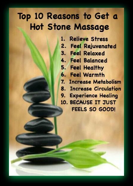Add Hot (Or Cold Stones!) on your back to any massage for extra relaxation. Hot stones help to relax your muscles, with less pressure. Cold stones are great for reducing inflammation and can help reduce head ache pain.